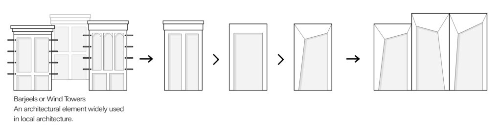 The project embarks on a comprehensive analysis of the architectural and cultural context of its location, grounded in a deep understanding of Emirati traditions and values. The design places a strong emphasis on harmonizing with the local surroundings, drawing inspiration from Dubai and Middle East’s vernacular architectural elements, such as Barjeels and Wind Towers. By reimagining their original forms, the project’s facade takes on a dynamic shape that seamlessly integrates with the local context. Additionally, the project leverages the site’s natural attributes to maximize the use of locally-sourced materials, techniques, resources, and climate characteristics, ensuring a sustainable and contextually sensitive design.